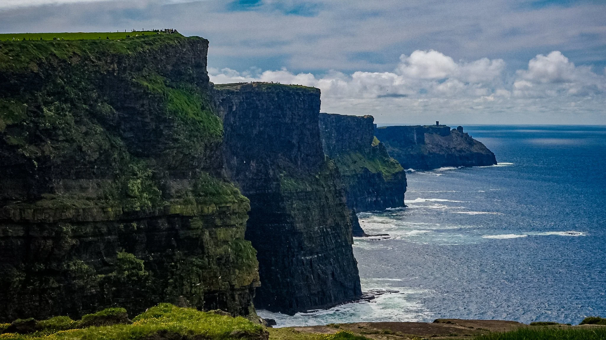 The Cliffs of Moher cascade into crashing ocean waves.